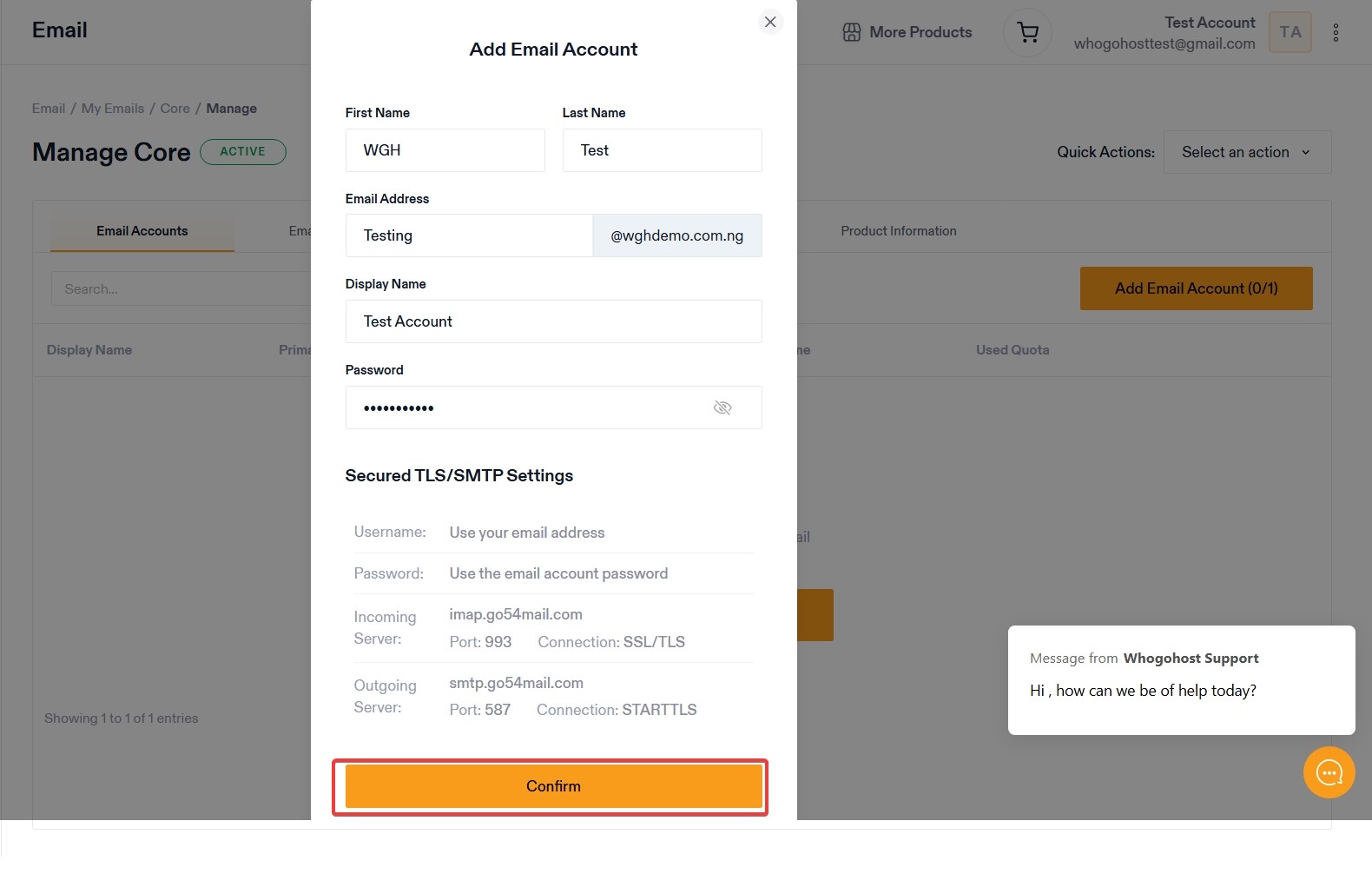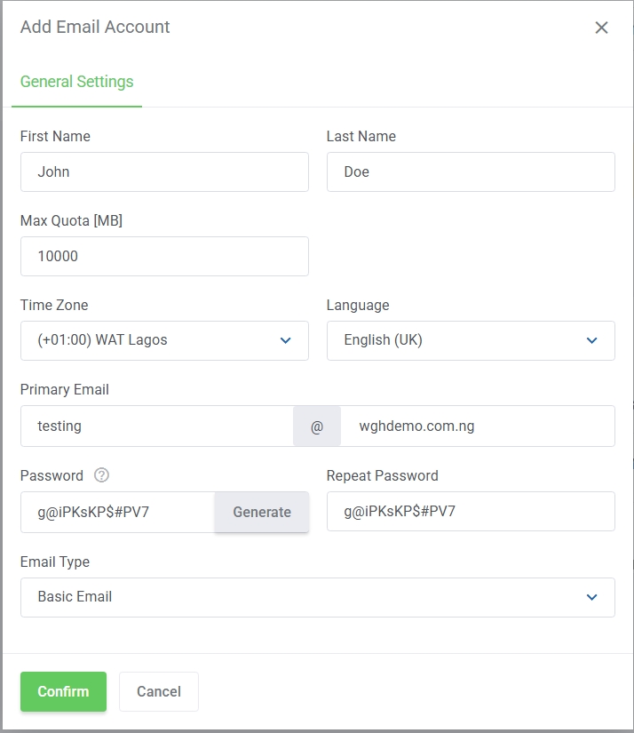 Once the account is created, a success page will be displayed. The details of the account that you have added, including a password that is generated for the user can be used for configuring the account in a desktop email client such as Outlook or Thunderbird.