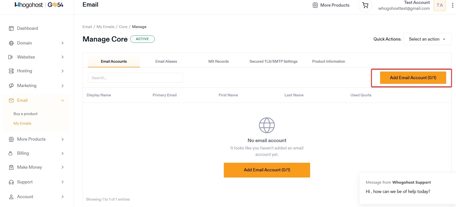- Go to the product page for your email hosting product you have purchased. Click on Email Accounts on the left Tab or Scroll to the bottom and click Email accounts under Emails and Domain Management