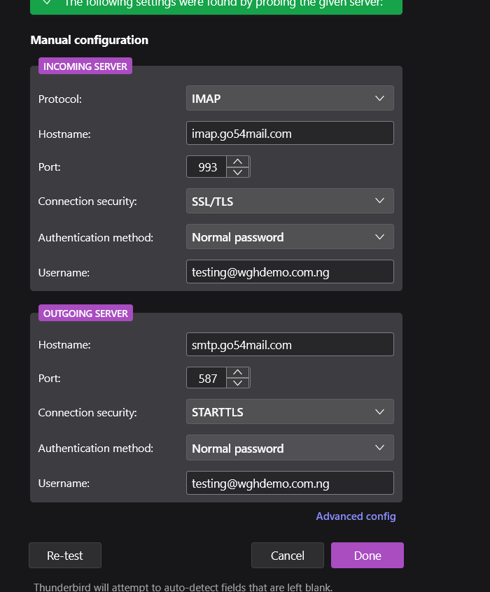 You can connect GO54 Mail to Outlook, Thunderbird, Apple Mail, or mobile apps using IMAP or POP. To do this use the following settings to manually configure the account on the mail client.